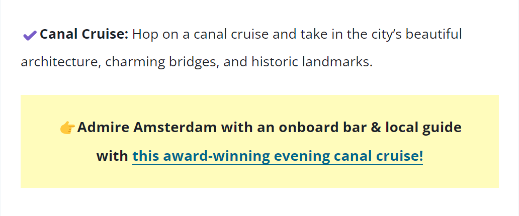 As we stated already, 100% of our blogging income comes from affiliate marketing. Early on, we included affiliate links within the text and then learned to utilize CTA boxes to promote specific tours or hotels to our readers.